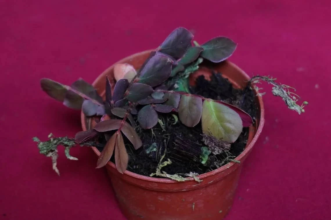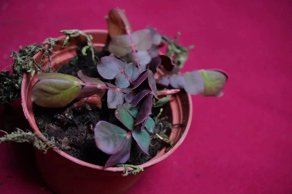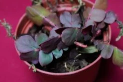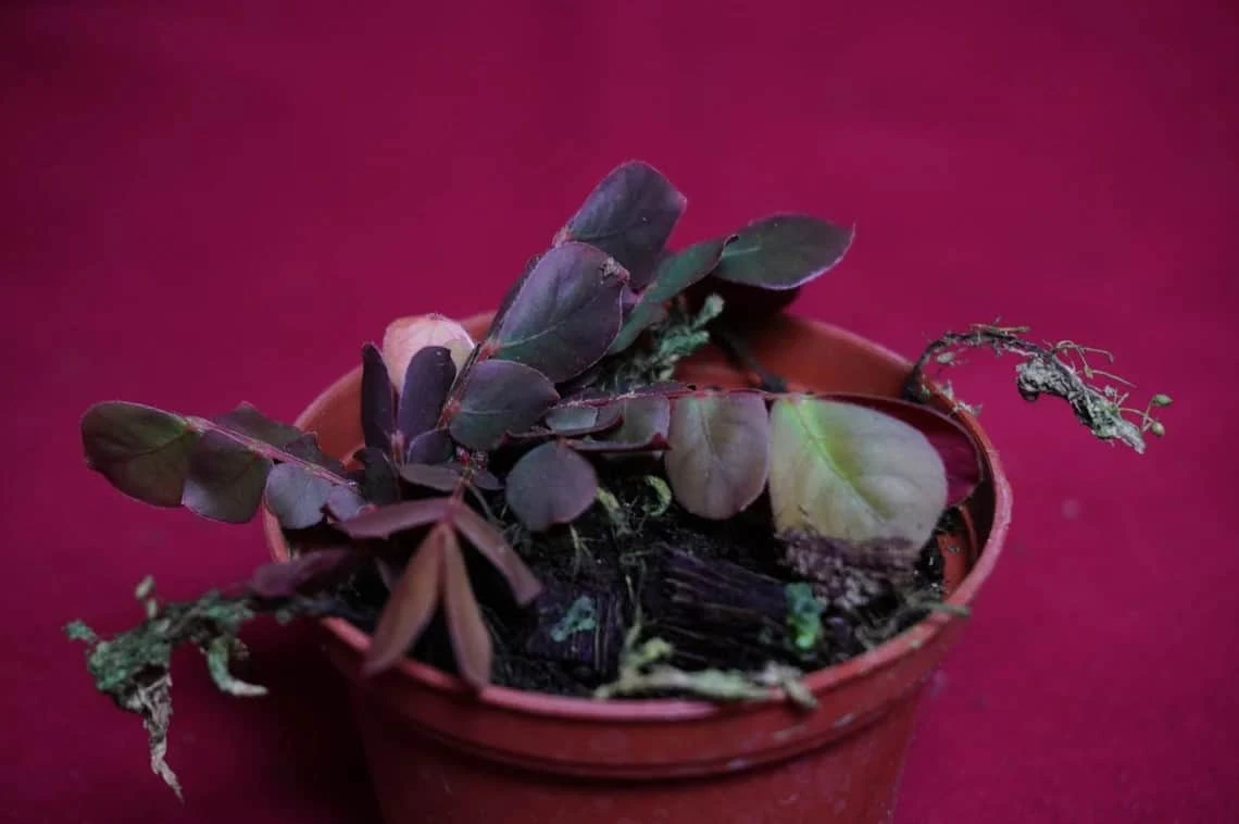 Description: We received the original plants some years ago from a grower in Ecuador as “unidentified.” While we have been able to confirm that it is a biophytum, we are unable to determine the exact species. It seems to be a bit unusual in the biophytum family in that it can naturally branch, and does not die off after blooming. New leaves come out in shades of green, orange, and purple, before fading to a deep, almost forest green. The small blooms are white, and appear right at the crown of the plant. Mature plants are about 10 inches tall, and can be just as broad, looking much like a small palm tree. The leaves do react to touch, by closing up. The leaves also close up in the evenings. This plant can suffer in low humidity levels, and is probably best kept as a terrarium plant. Please forgive the photos, these guys always close up when brought inside for pictures. Pic 1 is one of our parent plants.