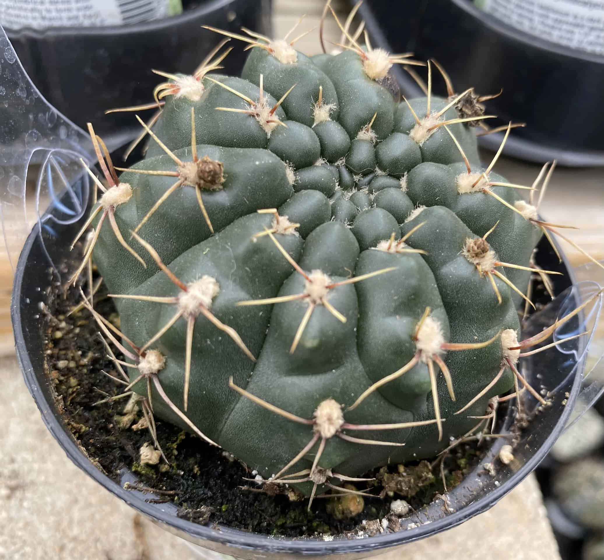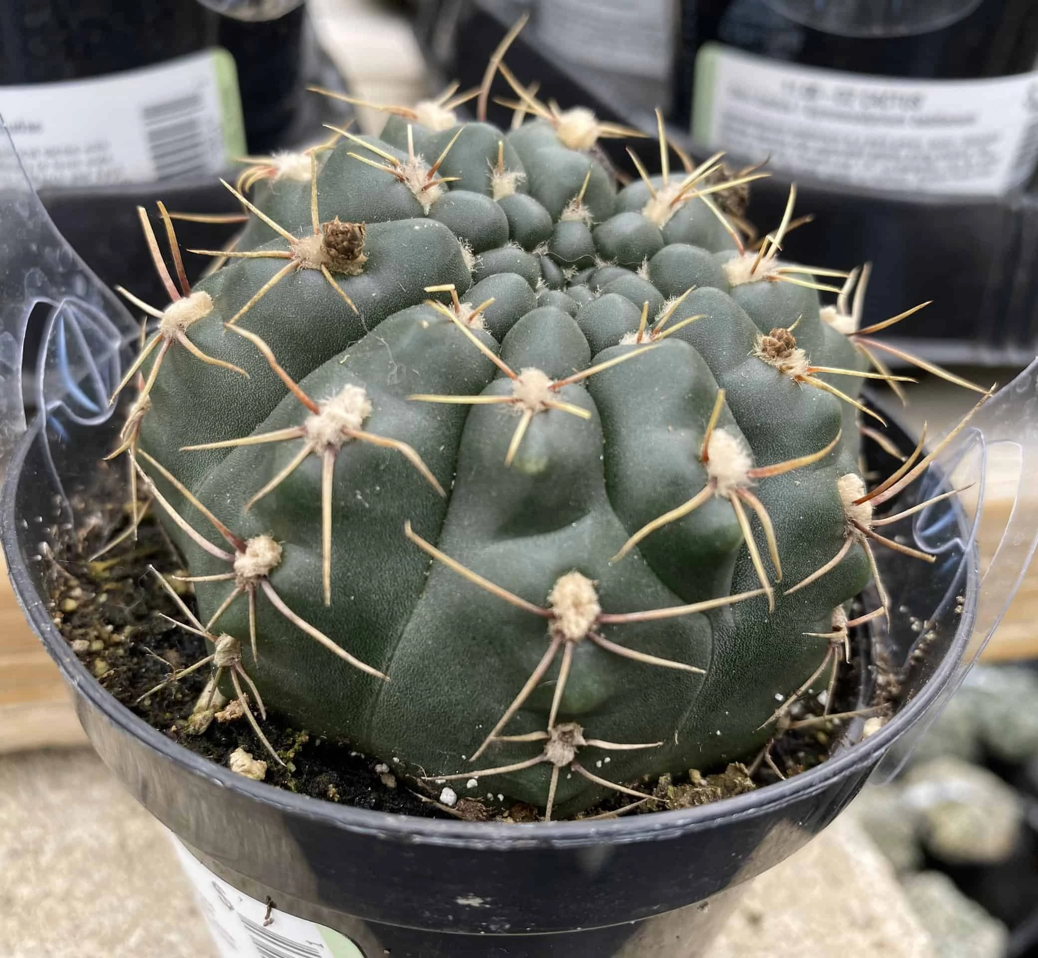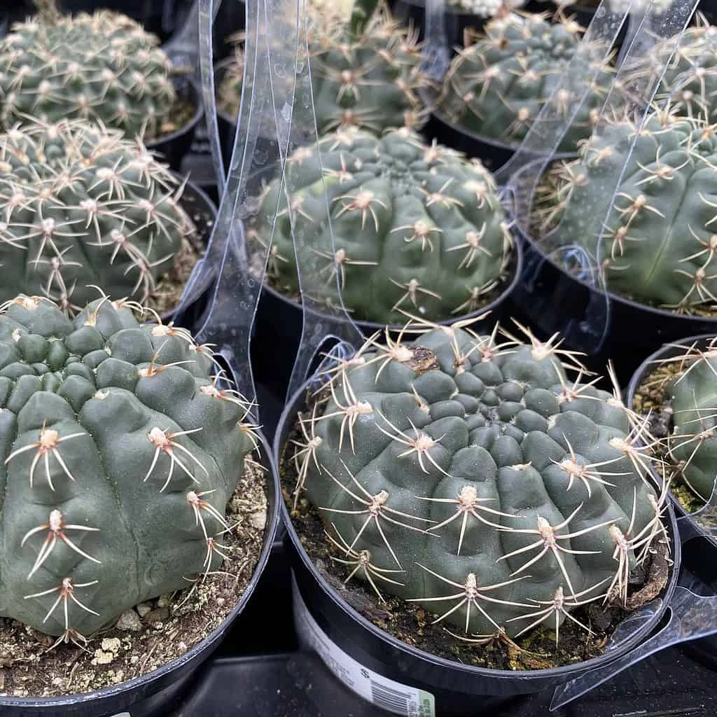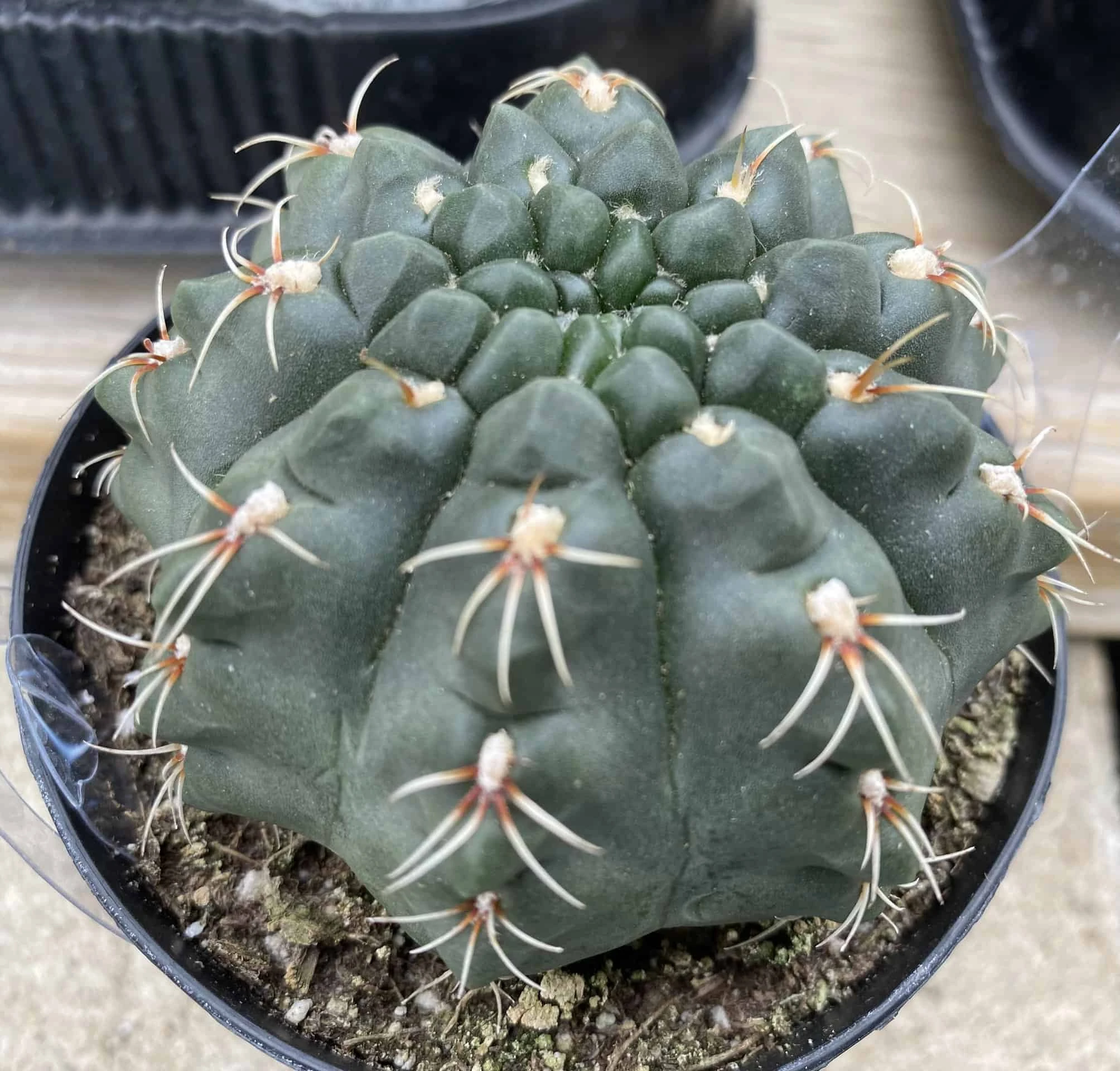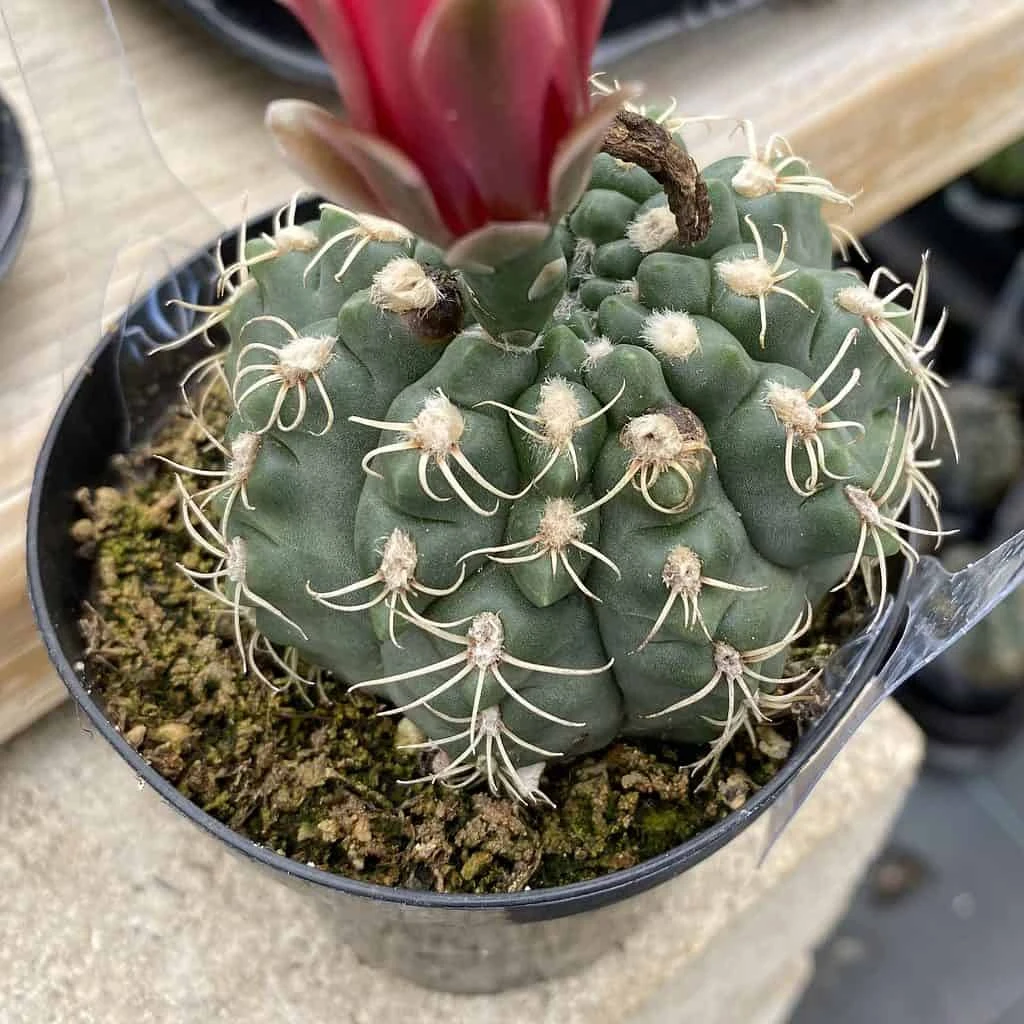 The Chin Cactus or Gymnocalycium Baldianum is native to Argentina. It is a dark green, semi flattened globular species that gives it the appearance of a chin, with spines along shallow ribs. It blooms in spring to early summer. Its flowers are funnel shaped and form at the end of spherical stems that can be up to 5″ in length, while the flowers are 1’5″ in diameter. Flowers are a range of colors from white, light pink, red, hot pink, coral or salmon. It reaches a height of 4″.