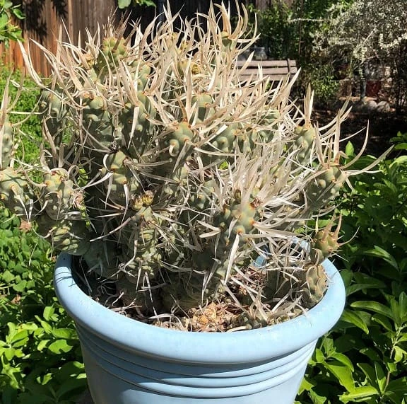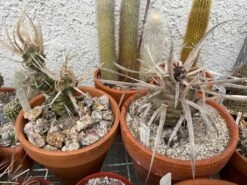 Tephrocactus articulatus var papyrocanthus is endemic of western Argentina. It is commonly known as Paper Spine Cactus, Paper Spine Cholla Cactus. Is a segmented bushy succulent slowly growing up to up to 30 cm, it is the typical form of a group of variety. It develops in little pine-cone shaped segments that are loosely attached to each other and fall easily and it has broad, raffia like, conspicuous , flattened spines which are not spines but thin ribbon like processes, and vary much as to their color, markings, and length. Blooms are either white or yellow. The white flowers make a nice contrast to the earth-tone colors of the plant. 1 to 5 cm long fruit is brown. It is fairly cold resistant and hardy to 15°F. Needs full sun, (with insufficient illumination stems get thinner as a result of the lack of sun) The main growing period is spring. It might produce some new segments in the autumn too. Needs good drainage. Plant will ship bare root.