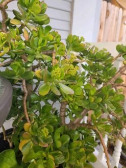 Jade plant also known as lucky plant and money plant. Young plants should be kept in bright, indirect sunlight. When it is well established it can be in sunlight. Water every 2 to 3 weeks or when soil is dry.