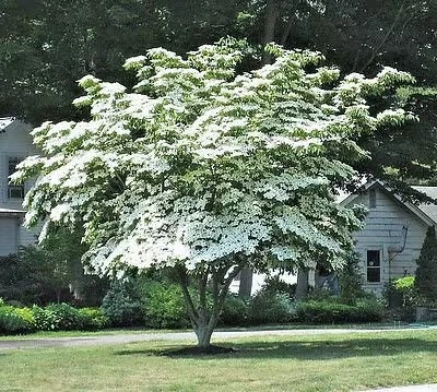 Kousa Dogwood grows 20 – 30 feet high and 20 – 30 feet wide. Round in shape this tree has dark green leaves. Flowers bloom in May to June.