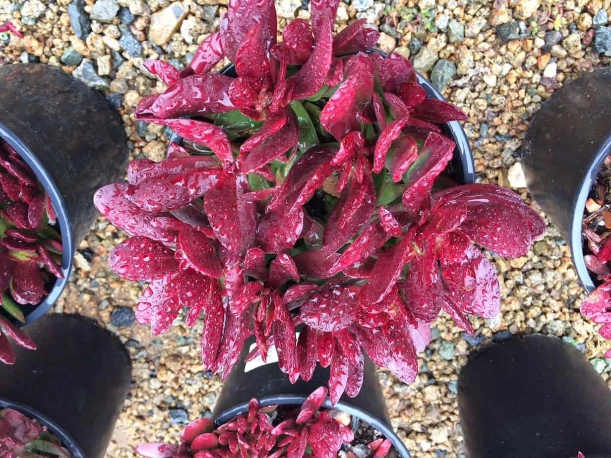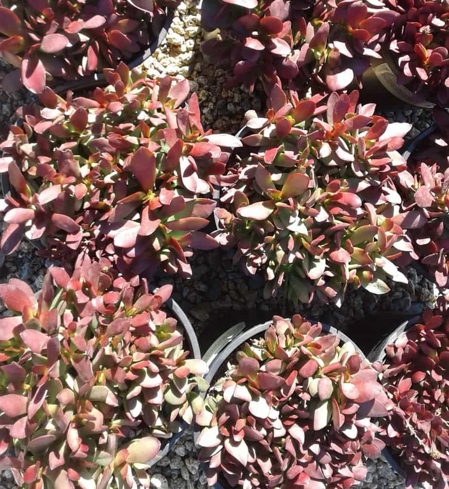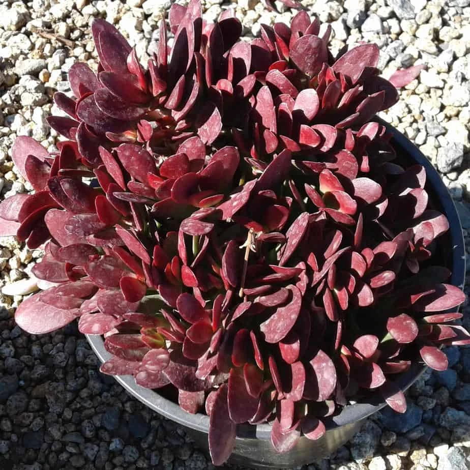 The Crassula Platyphylla is a lovely, colorful plant that is a beautiful ground cover. Gorgeous deep red/burgundy colored plant. Vibrant when exposed to direct sunlight. Requires very porous soil. Protect from frost, provide bright light.