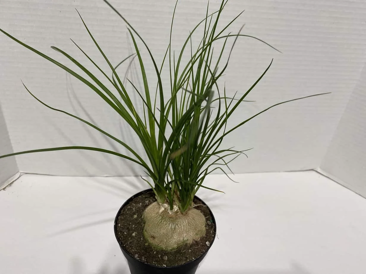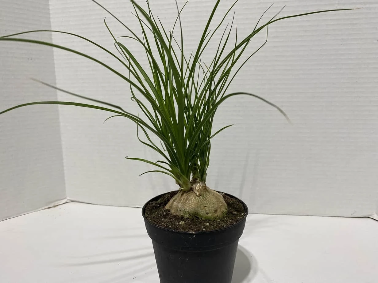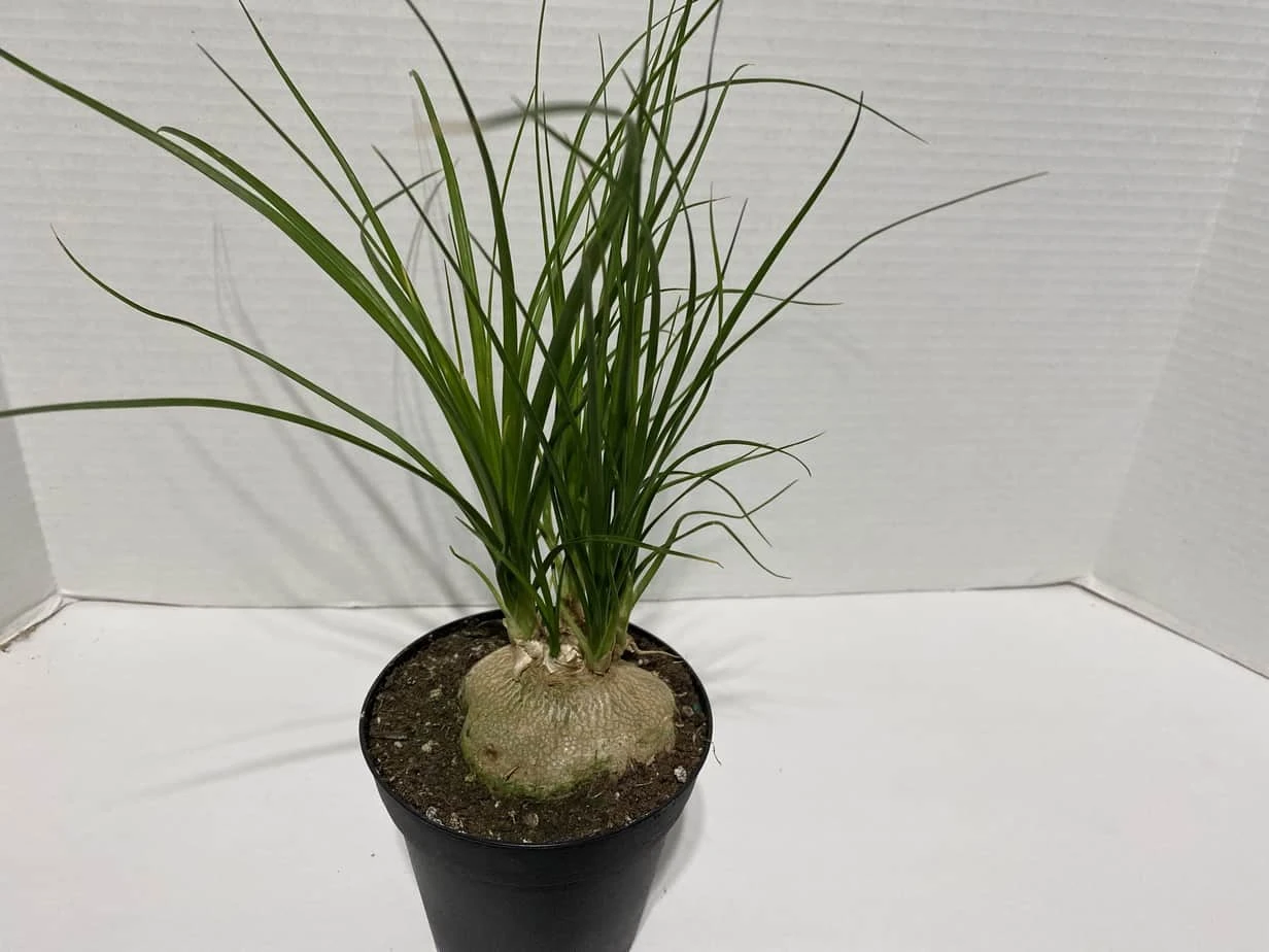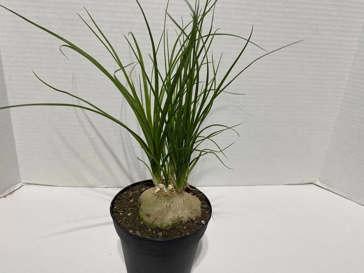 This plant is the Large Beaucarnea Recurvata, also known as the Ponytail Palm. It is made up of a large bulb with many thin, pointed green leaves. Despite the name it is not related to the palms, but is actually a succulent, related to the Agave. These are great indoor plants if you have good or high light conditions. They do like some humidity in their environment. In a dry environment the tips of their leaves can turn brown. If the brown tips are trimmed the new ends will then turn brown, so it is best to just leave them with the brown ends on the long, thin leaves.