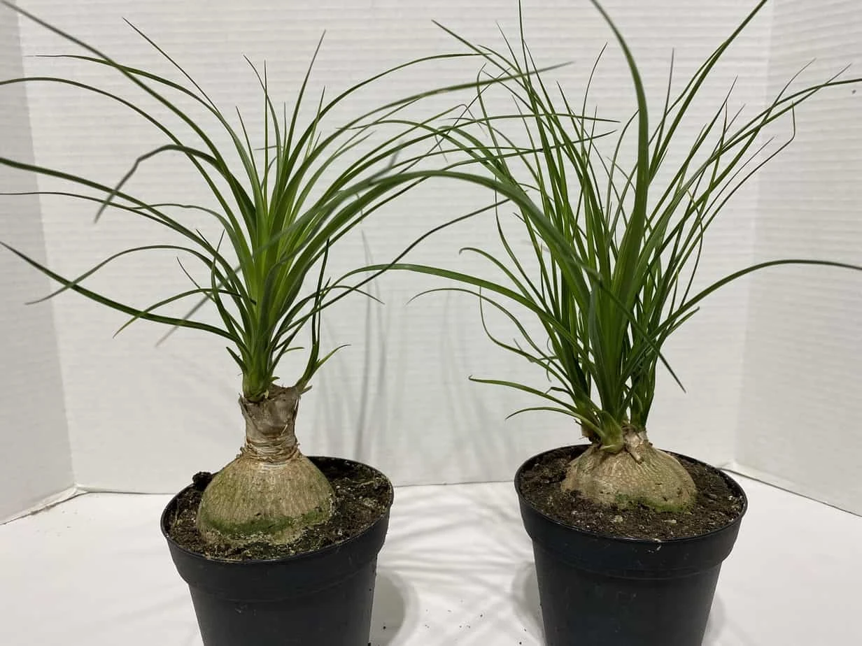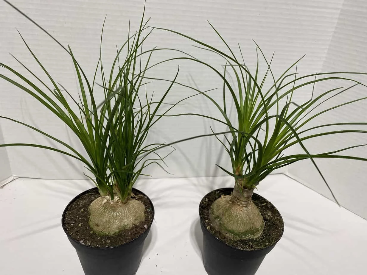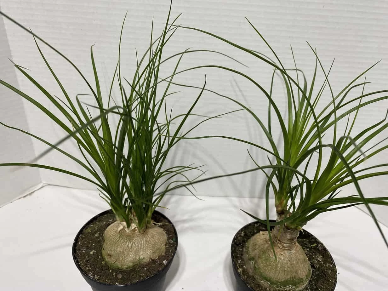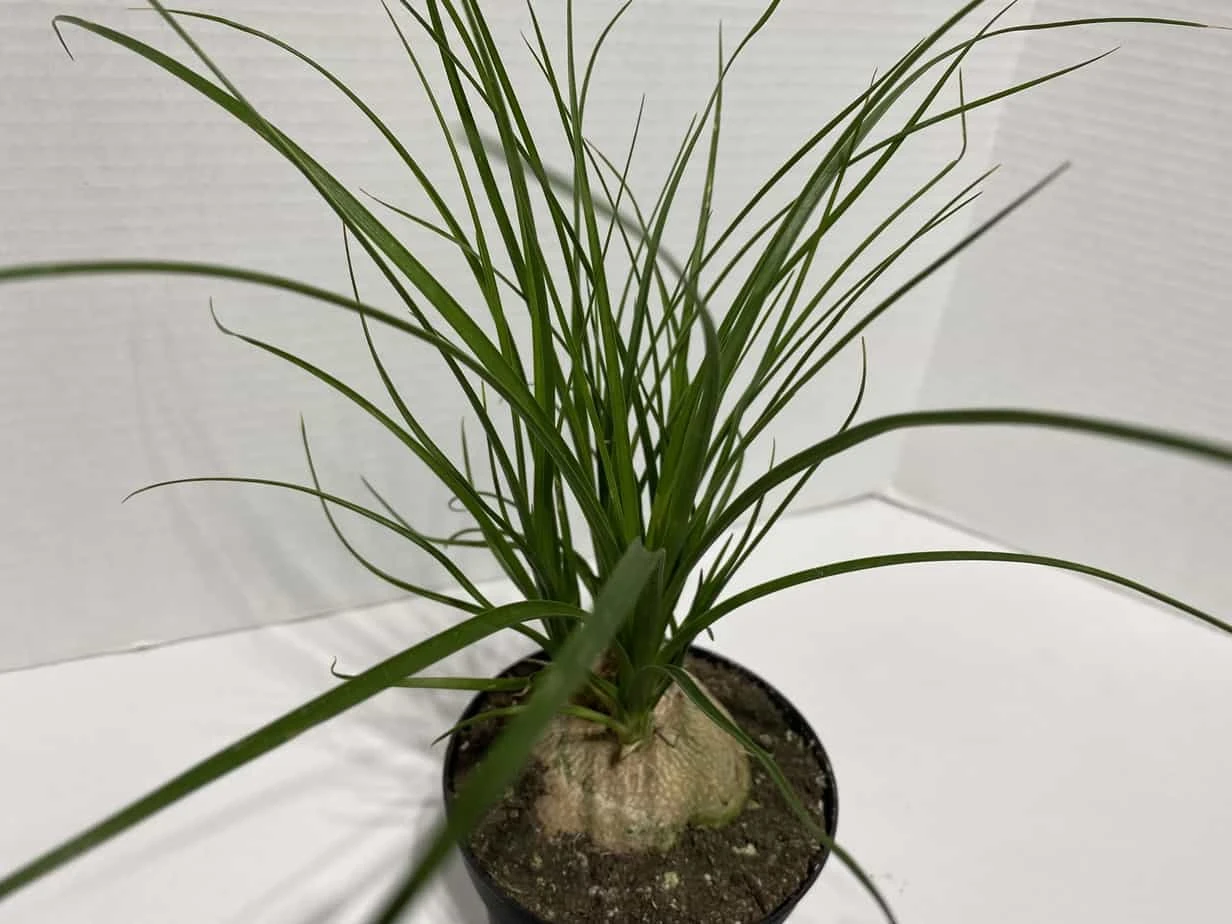 This plant is the Large Beaucarnea Recurvata, also known as the Ponytail Palm. It is made up of a large bulb with many thin, pointed green leaves. Despite the name it is not related to the palms, but is actually a succulent, related to the Agave. These are great indoor plants if you have good or high light conditions. They do like some humidity in their environment. In a dry environment the tips of their leaves can turn brown. If the brown tips are trimmed the new ends will then turn brown, so it is best to just leave them with the brown ends on the long, thin leaves.