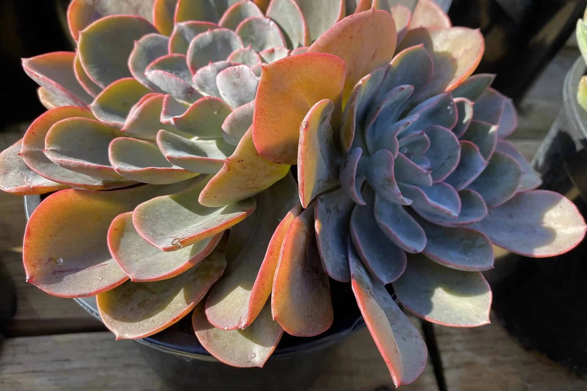 The Mature Echeveria Swirl Hybrid is a large rosette that offsets readily. I has amazing coloring in bronze with gold highlights, green and brown.