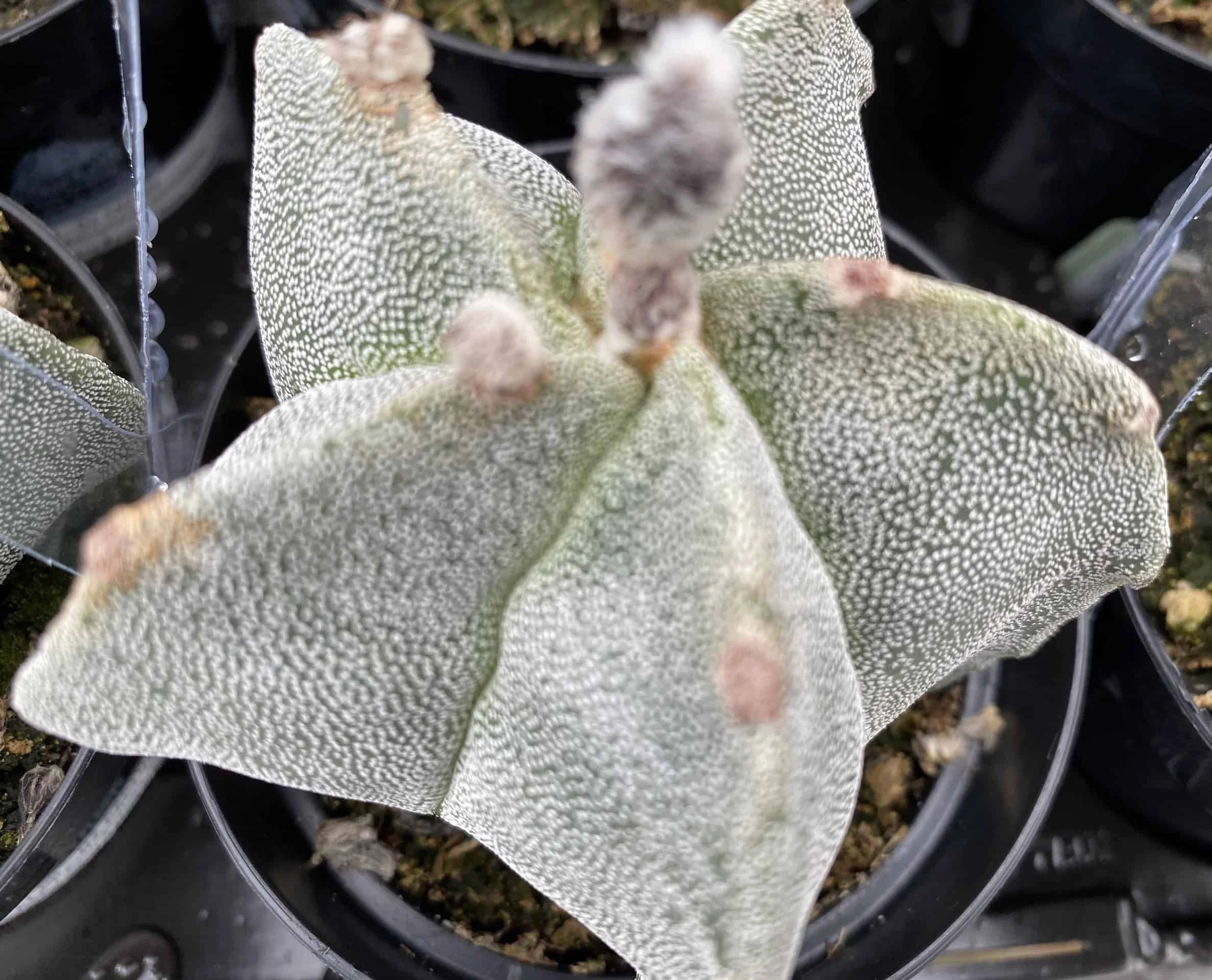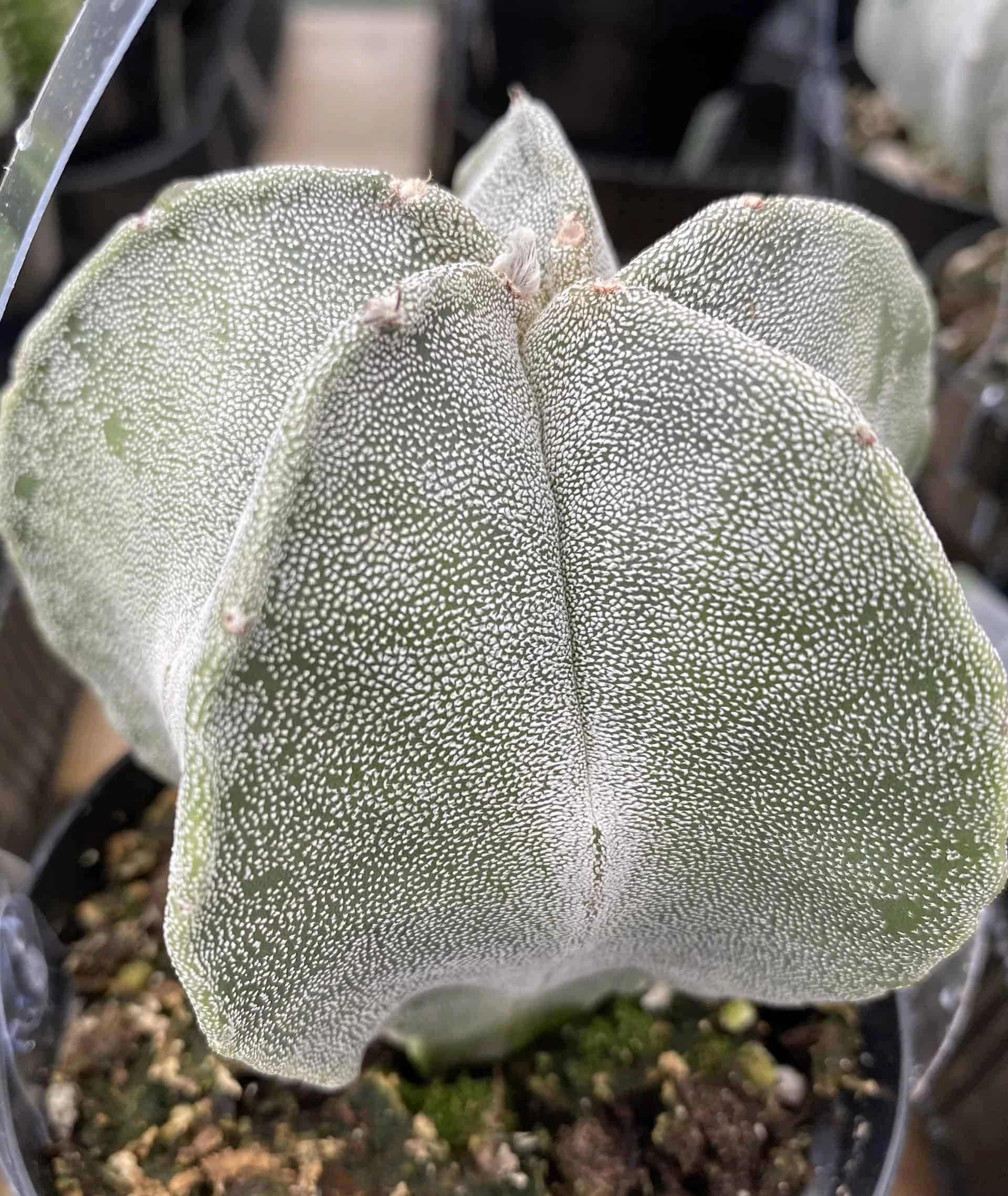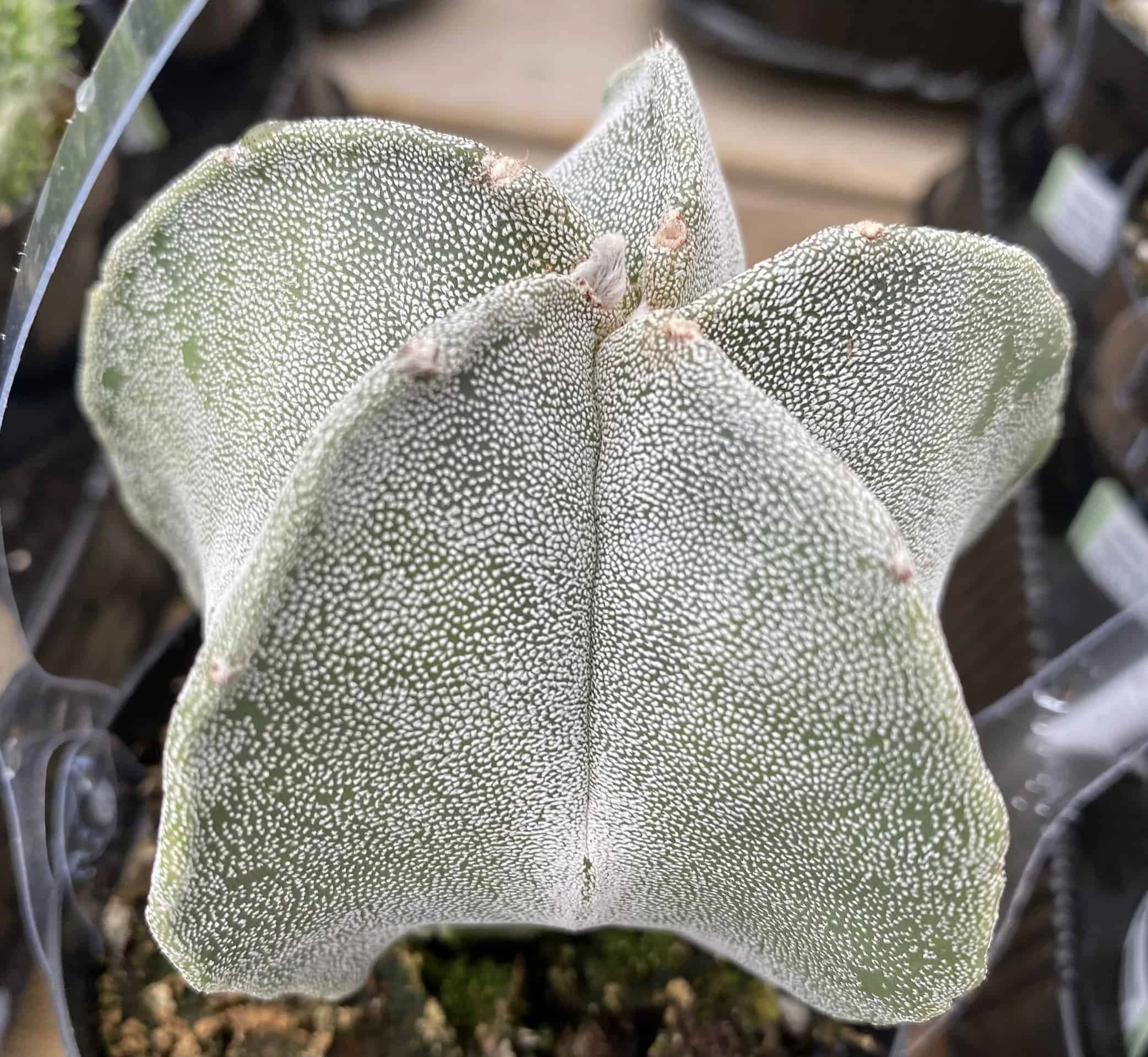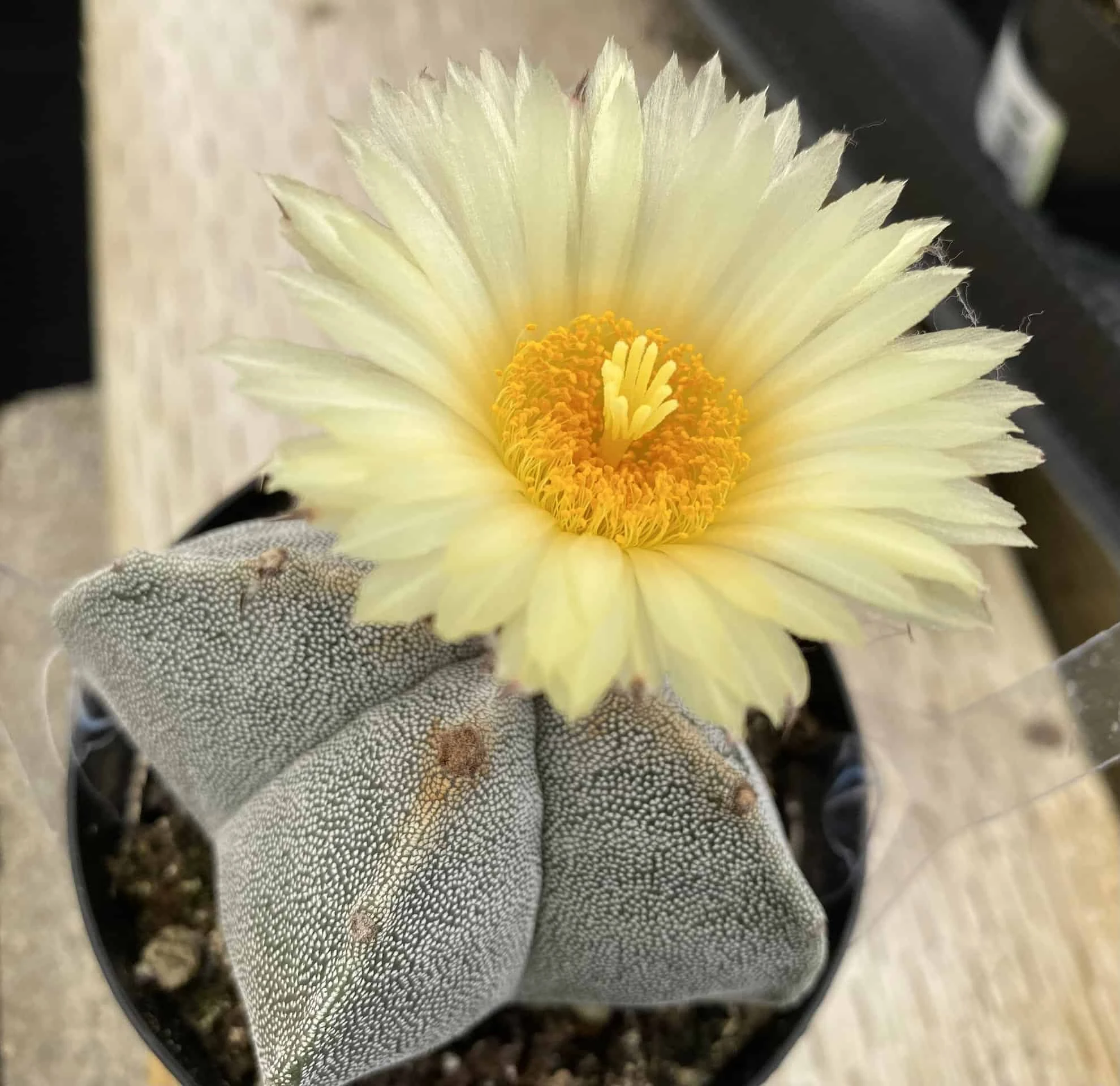 The Medium Bishop’s Cap or Astrophytun Myriostigma is native to Mexico in the mountainous terrain at 6000 feet in altitude. This is basically a globular cactus that becomes more columnar with age. Spines are usually not present, rather the body is densely flocked with silvery white “scales”.It produces gorgeous yellow blooms during the summer months. Very drought tolerant once established.