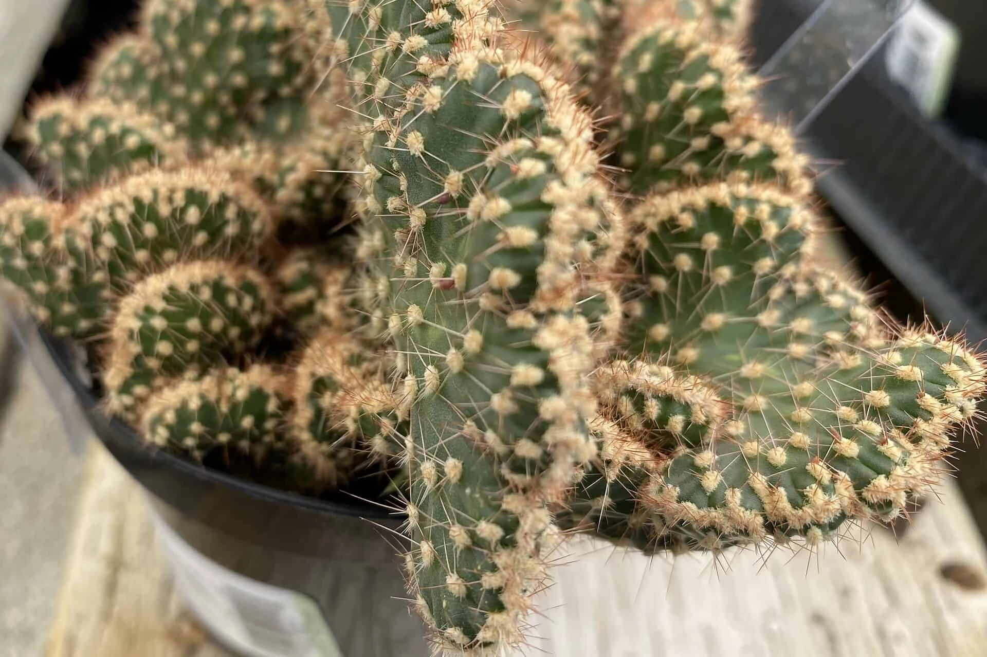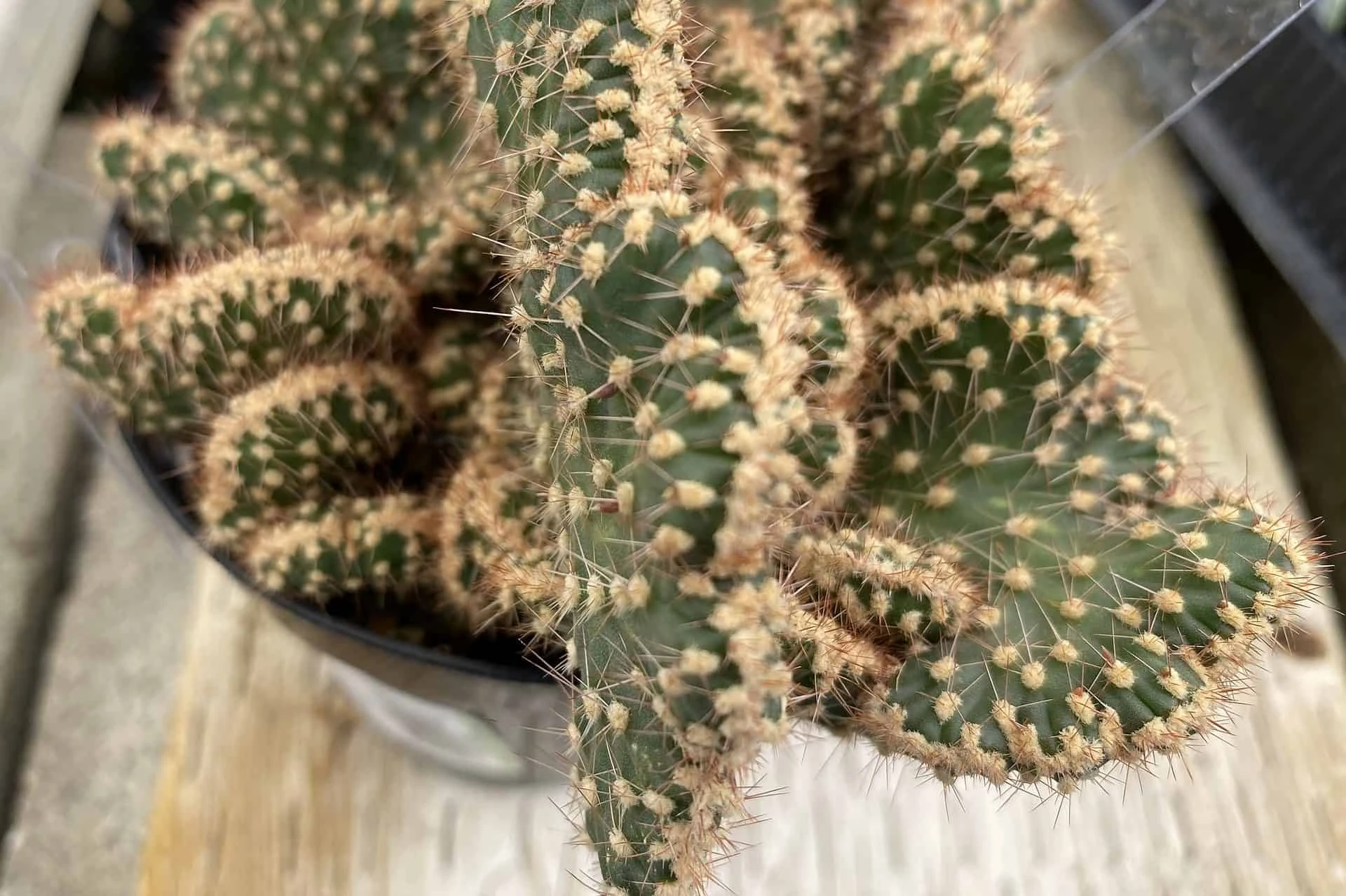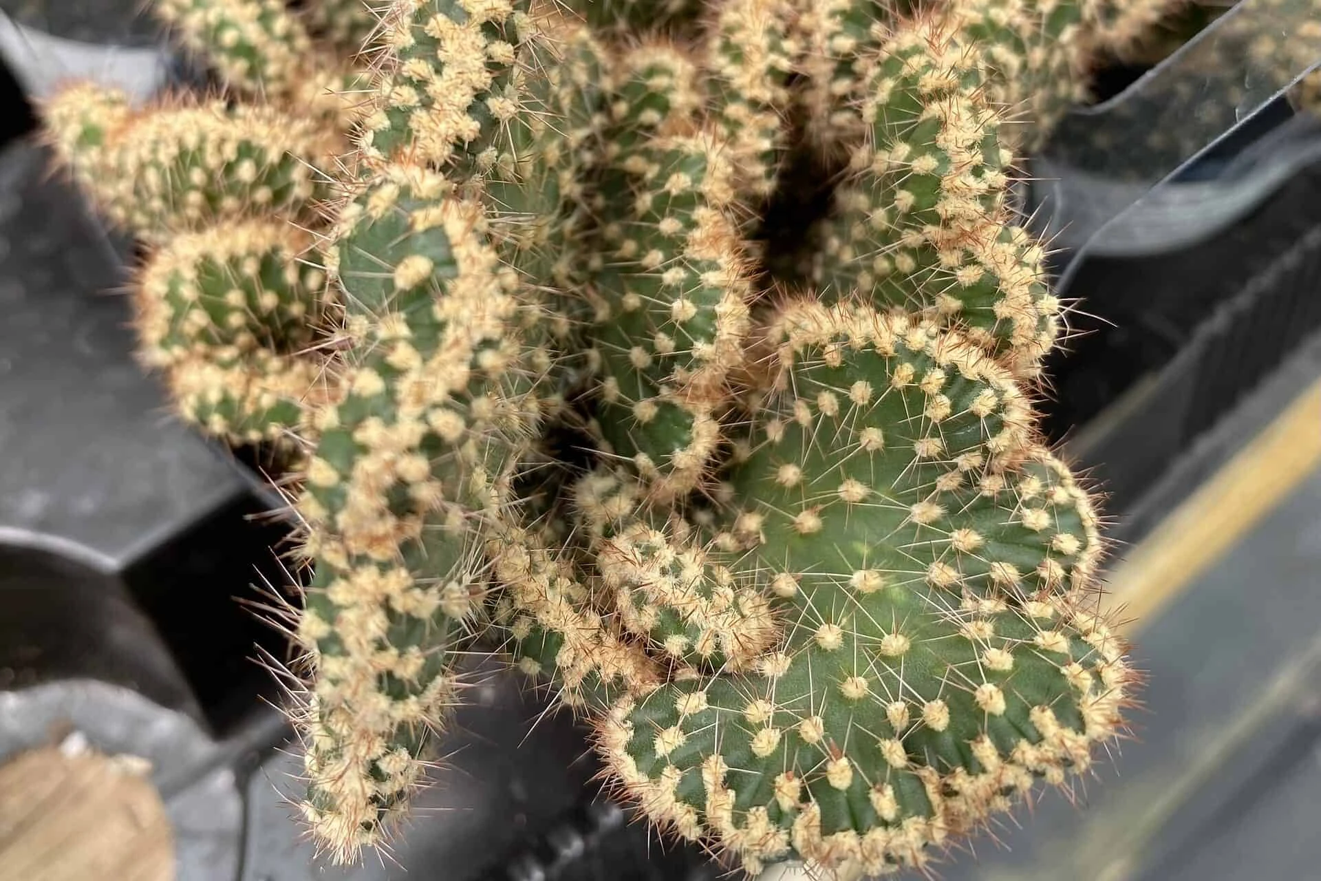 Medium Opuntia Parryi v. Serpentina Cristata is a very different and hard to find Opuntia. It is a vigorously growing crest of a smaller Opuntia. This unique plant is native to Baja California. It forms low growing clusters of a deep green. The fan like edges of this gorgeous Opuntia are marked with tan. The entire plant is also marked with tan speckles. The Parryi is somewhat cold tolerant to 32 degrees, but it is best to provide frost protection to prevent possible scarring. It will not tolerate extended freezing temperatures. Due to the rarity of this plant it is a must have for the serious collector.
