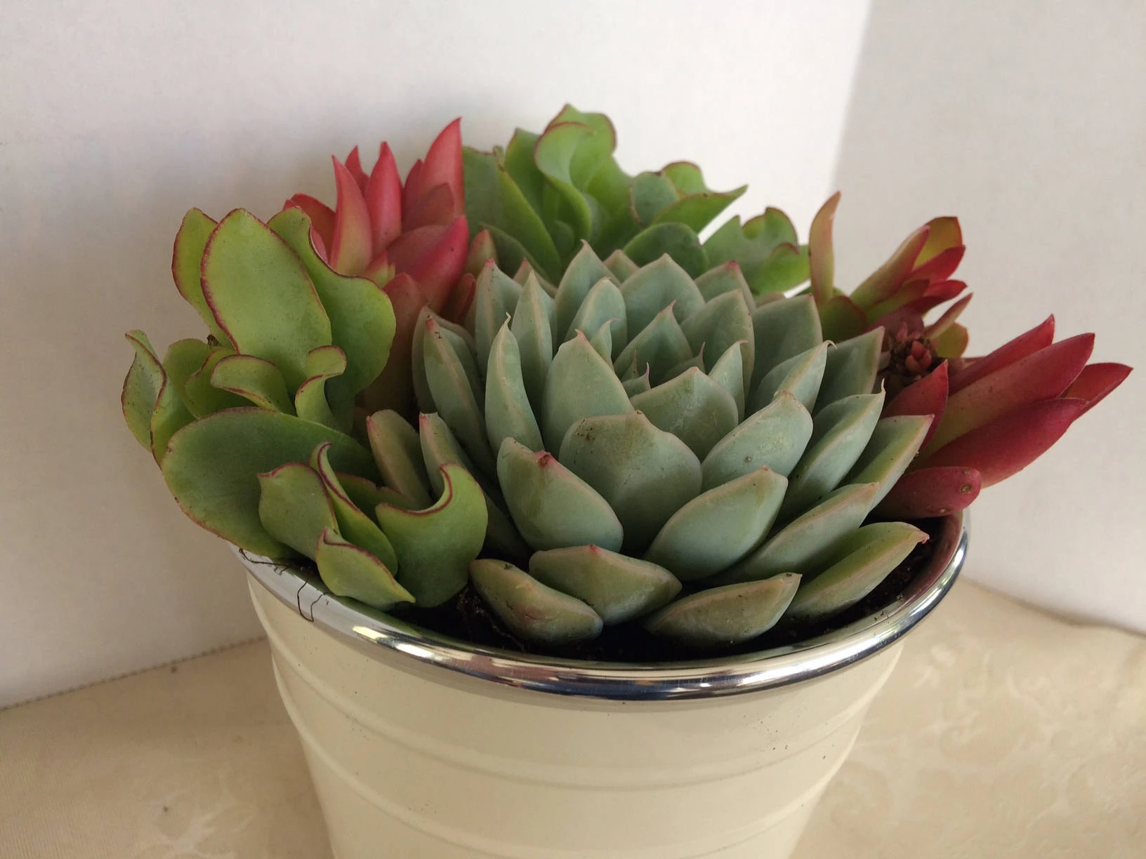 This is a beautiful, completely assembled medium dish garden. This arrangement features a large center succulent that is assorted, colorful succulents.These are planted in a medium, round, white enameled planter that has a chrome rim. Its dimensions are 5 inches in diameter and 4.5 inches in depth. This dish garden is a wonderful housewarming gift, hostess gift, a get well wish, a table centerpiece or a gift to yourself. It comes as shown, or with similar plants, depending on the season and availability. These dish gardens are unique as they come as shown and no assembly is required. It is already complete, for you to enjoy! If this is being sent as a gift, please include whatever greeting or message you would like enclosed. A complete care sheet will be included. If you are ordering with temperatures of 34 degrees or less, please consider ordering a heat pack. You will receive one complete White Enameled Planter fully assembled. It will be carefully wrapped for shipping and shipped via USPS Priority Mail. Please allow 7 days from placing your order for shipment.