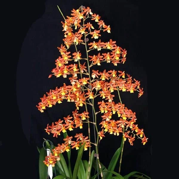 Odontocidium Sunny Daze ‘Hilo Bay’ is an Oncidium intergeneric that has beautiful orange petals and a yellow lip, the mass of flowers are on tall spikes.