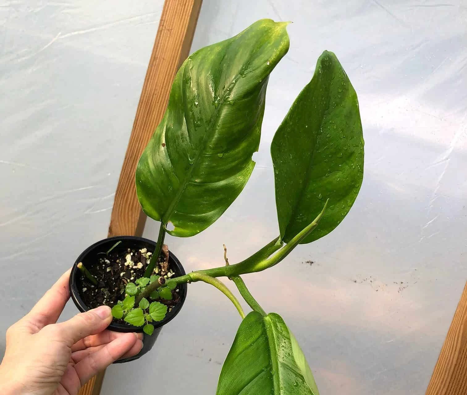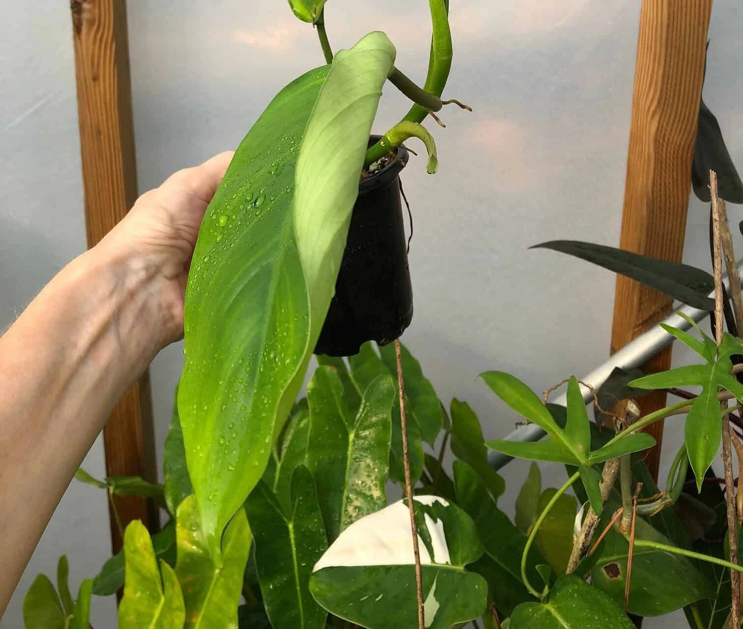 Large boat-shaped decorative leaves, blushed beneath in high light; thick succulent midribs accent dull-glossy fleshy leaves overlapping shingle-like on a very thick stemmed clambering vine. Easy indoor potplant for mossed pole culture. You can plant them in a beautiful pot and place them on a trellis so that the aerial roots can attach and they can climb. Allow the soil to dry before watering them, and make sure there is an excellent draining hole in the pot to prevent root rot.