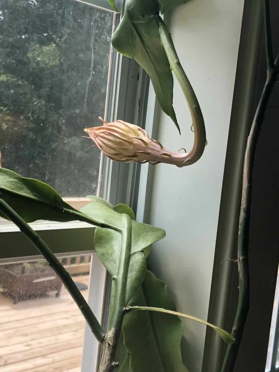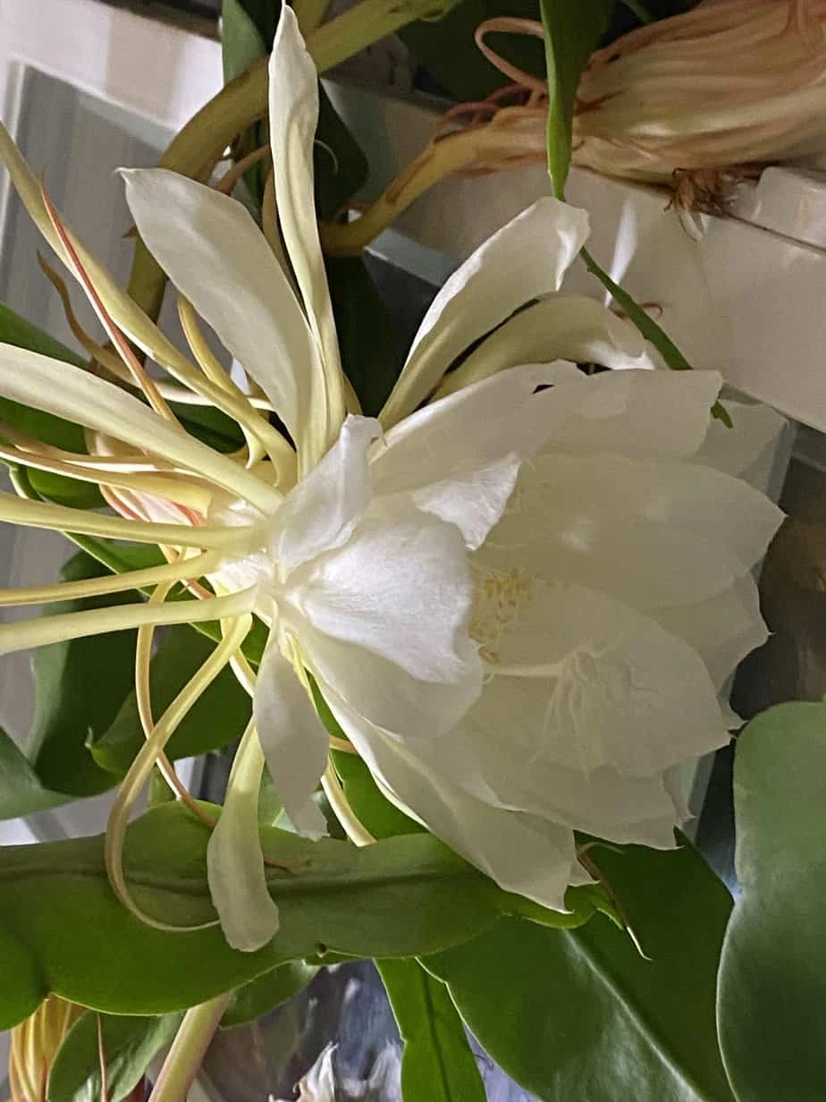 The Queen of the Night, Night Blooming Cereus is a drought-tolerant and low maintenance plant. Allow the soil to dry completely between watering and place the plant in a prominent location, as a “Queen” to receive adequate sunlight – partial to full sun. Fertilize once in Spring and once she starts to bloom, fertilize after every bloom cycle completes. If she blooms nine times in a year as my mother plant often does, then fertilize 9 times, following the end of each blooming cycle.