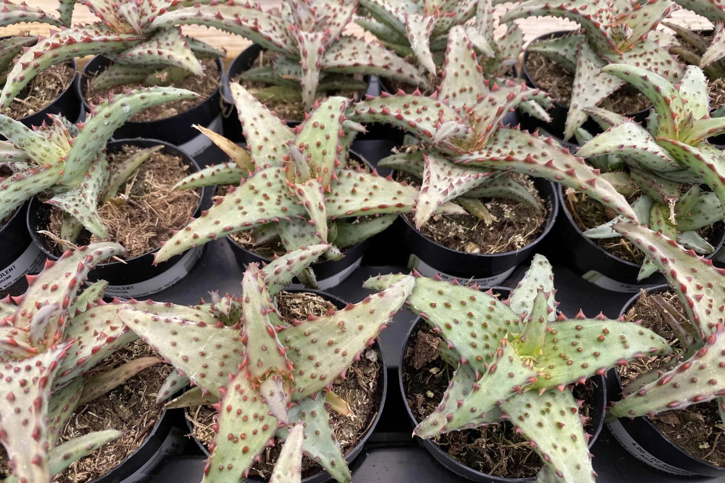 The Small Aloe Castilloniae is a unique and very different plant. This aloe forms a beautiful green, rosette shaped plant that is covered with deep rose colored, raised speckles. This is a very limited hybrid.
