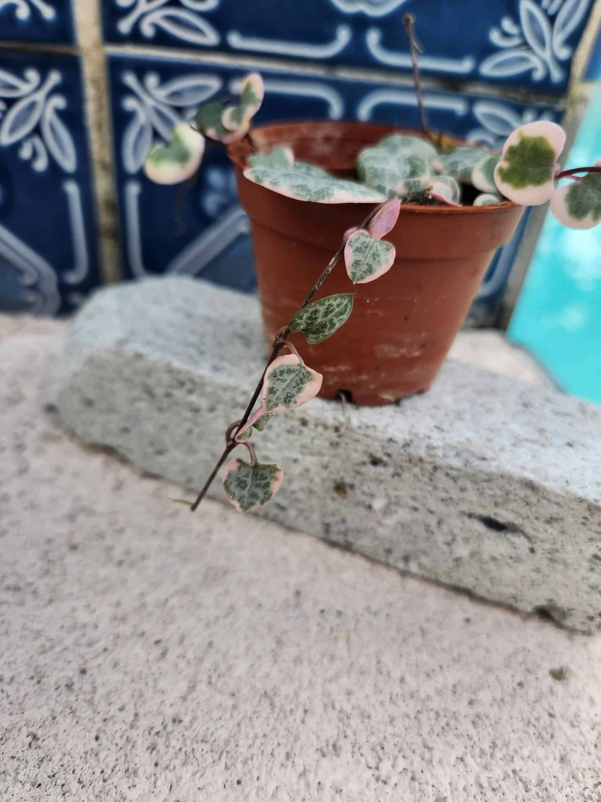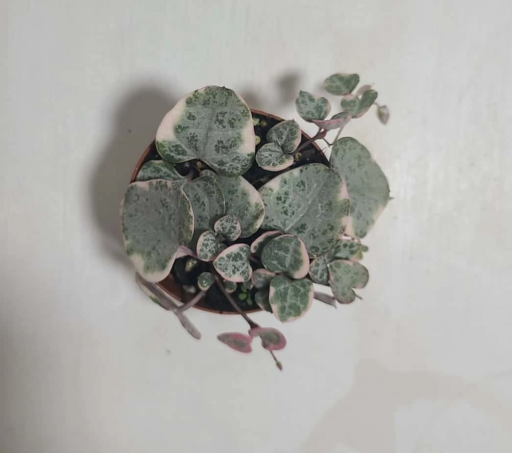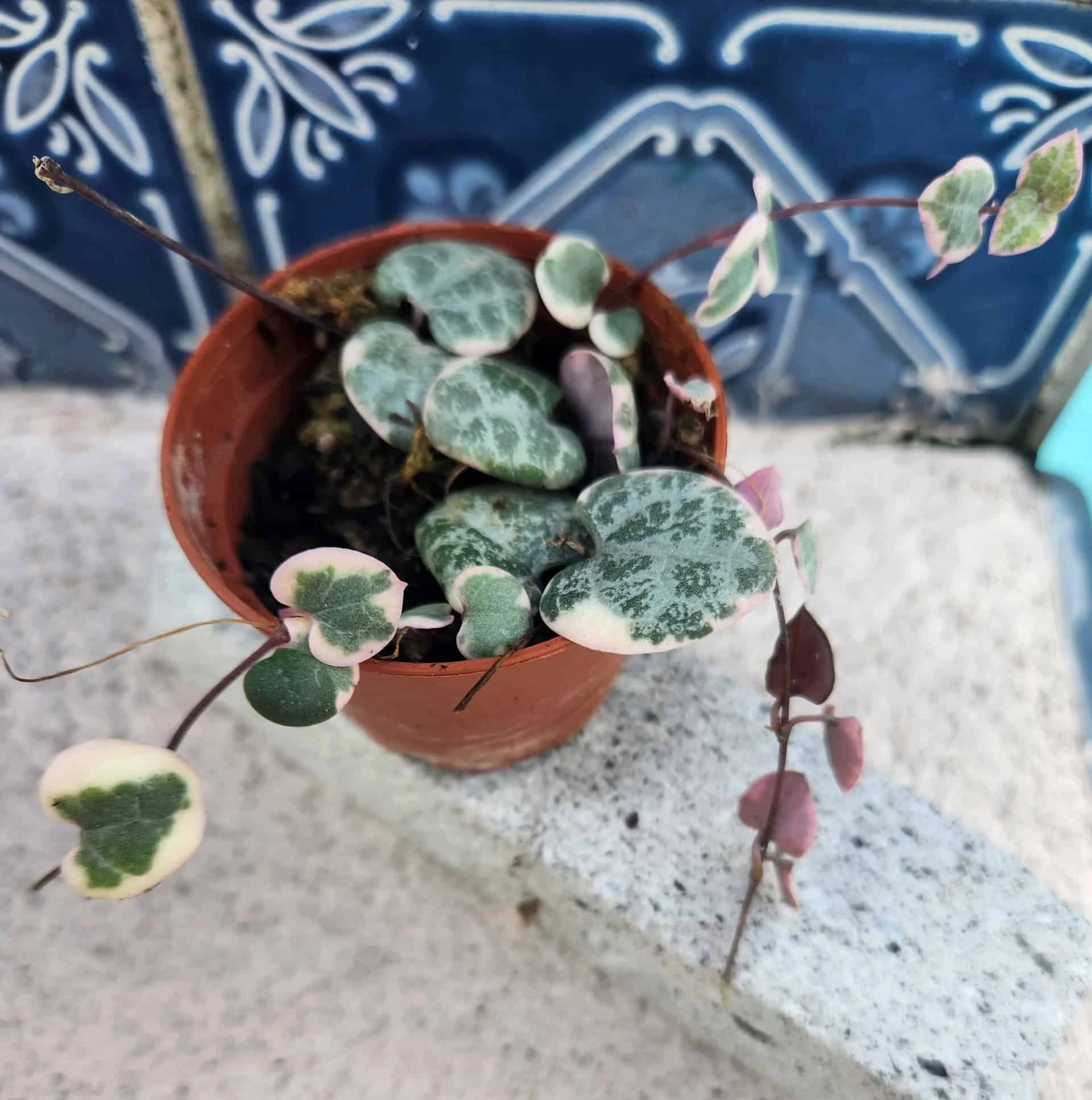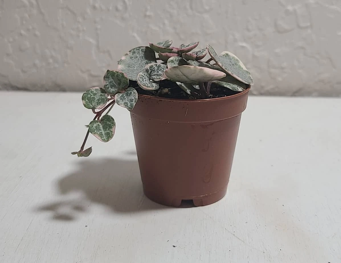 “String of Hearts” is a trailing succulent with cream, pink, and green heart-shaped leaves. Its stem has a purple tone. Tiny tubers form on the base of the leaves, giving it the nickname “Rosary Vine.”