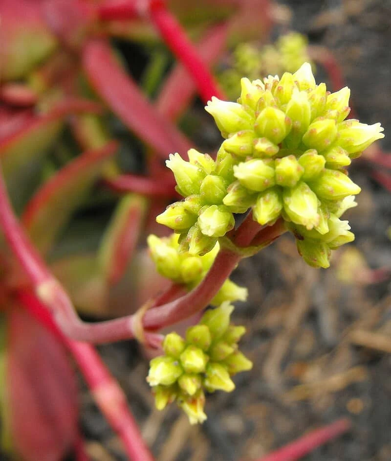 Crassula pubescens subsp. pubescens is a small mat-forming plant which is usually not more than a few inches tall. It has many slender stems which are initially upright, but in time they spread out laterally and root as they go, with new shoots emerging from the nodes. The leaves are spoon-shaped, succulent, and about .4 inch to 1 inch long. In the shade they are green, but in an exposed to the sun they become flushed with red. Sometimes just the edges are reddened, but often the whole plant turns beet-red. Because of its small size and spreading habit, Crassula pubescens is well-suited for use as a small-scale ground cover, or for filling in between larger plants in a dish garden or planter.