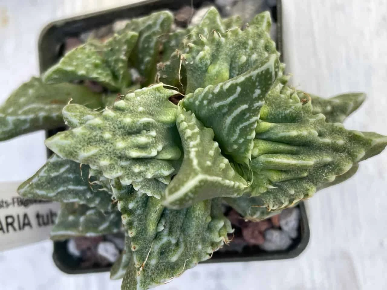 Faucaria tuberculosa Faucaria tuberculosa is has chunky, triangular leaves with distinctive, bumpy or “tubercled” surfaces, it is also known as ” Warty Tiger Jaws”. This subspecies has a variable appearance and some individuals have gentle teeth with tendrils lining their leaves. It is a compact, clumping species from South Africa and it produces large, dandelion-like blooms from late summer to fall that open each afternoon and close by nightfall. May be grown in full sun, but protect from frost. Main picture is of my mother plant, all other(s) are shown here in 3″ pots (for size reference).