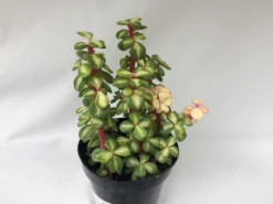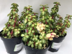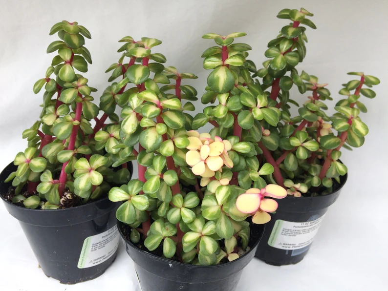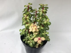The Medium Portulacaria Afra Medio-Picta is native to South Africa. This succulent is also known as the Mid Stripe Rainbow Bush and is very difficult to find. This is a very slow growing succulent shrub with beautiful,, bright reddish pink stems holding small 1/2 inch long oval green leaves that have wide white stripes down their middle. Some leaves have little or no green. Grows to a height of 1-2 feet and a width of 1-2 feet. It produces lavender blooms, but blooming is infrequent. Plant in partial sun to light shade and water sparingly.