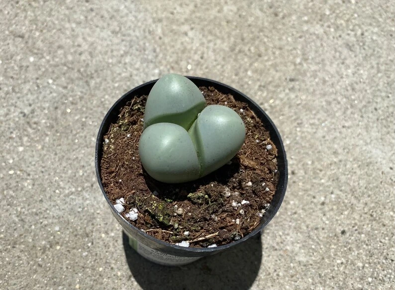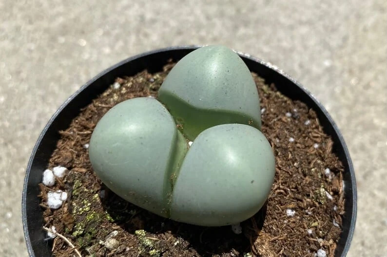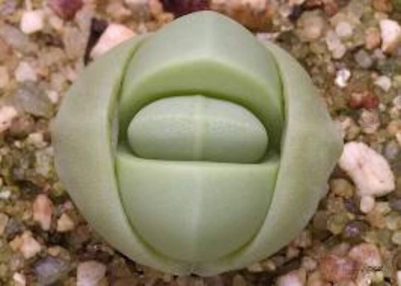 From South Africa, the Argyroderma is two fleshy leaves forming what appears to be a green-blue Easter egg. Silky flowers grow in Autumn in various colors. The Argyroderma SPP. is a light green succulent that will have a colorful flower bloom right out of the middle. It is quite an exciting event.