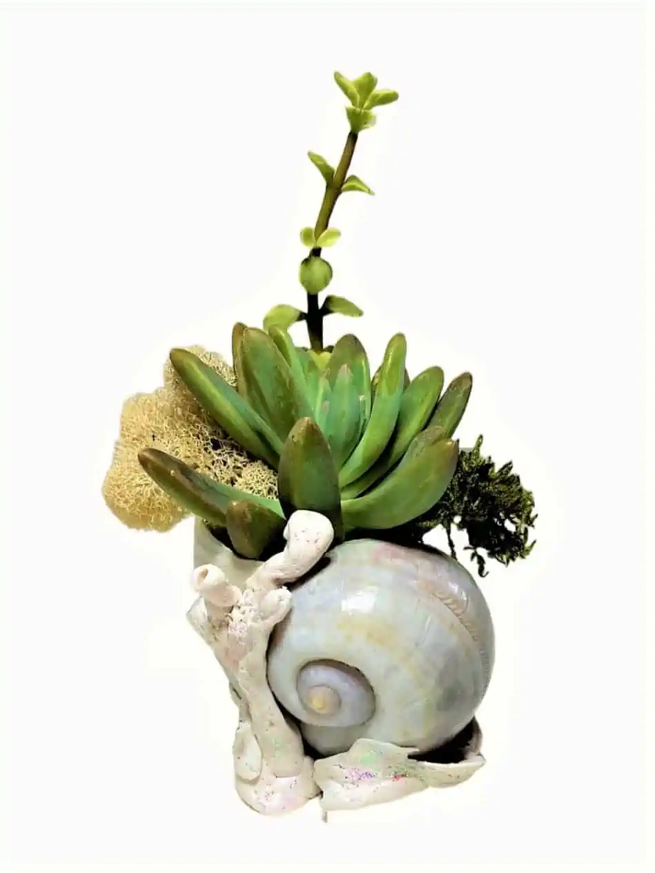 Small Seashell planter is loaded with desirable succulents. The shell is the perfect size for a teachers desk or office workspace ( 5″ x 5″). You just have to mist it 2-3 times per 7 days. When plants get to big, just trim or start a new collection. The shell does have a coral placement holder made from polymer. Gar-Zen Botanical Designs uses only organic plants that are never exposed to pesticides or harmful chemicals. We grow totally organic. Your planter comes in a giftbox ready to give. We always offer free shipping. Gar-Zen Botanical Designs is a Black and minority women owned business located in South Florida.
