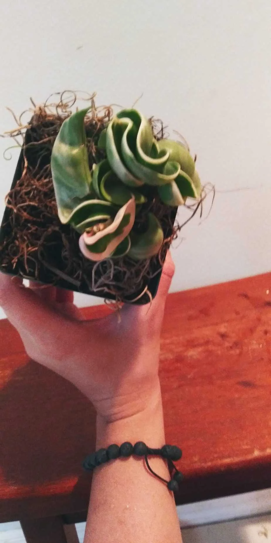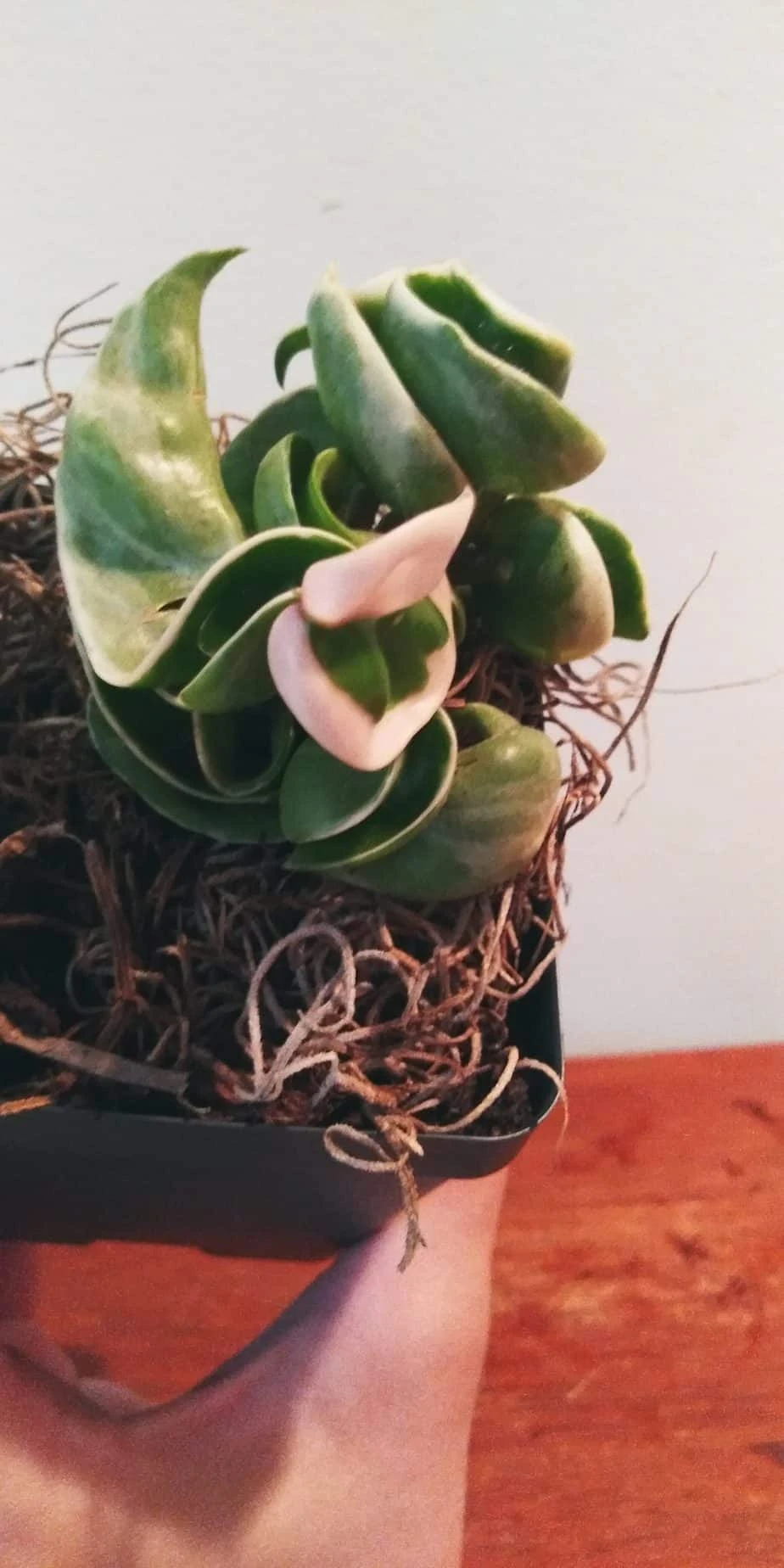 Pretty little hoya carnosa. It is variegated so it has some white and pink. Itβs in a mixture of soil and moss. 4 inch pot.