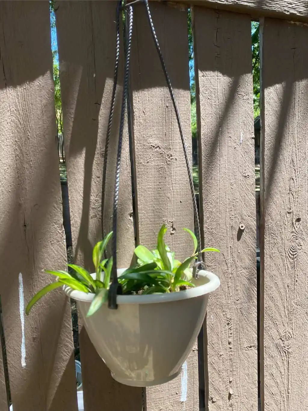 Hanging basket variegated hoya easy to care for given bright indirect light or high bright indirect light when placed out side do not give too much direct light will scorch plant. Water once or twice a week depending your environment enjoys semi moist soil. Fertilize up to twice a month